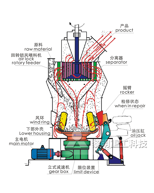 由熱風爐出來的熱風或廢氣,在系統(tǒng)風機的抽引下,進入立式磨煤機,與磨內(nèi)被粉磨的原煤進行充分熱交換后,帶起煤粉在分離器處進行分選,細度不合格的粗煤粉重新落到磨盤上進行粉磨,合格的煤粉隨氣流進入防爆氣箱脈沖收塵器被收集下來,經(jīng)過分格輪卸入煤粉倉。 原煤中的雜物,如部分煤矸石、金屬塊等,通過風環(huán)、吐渣口排除磨外。
