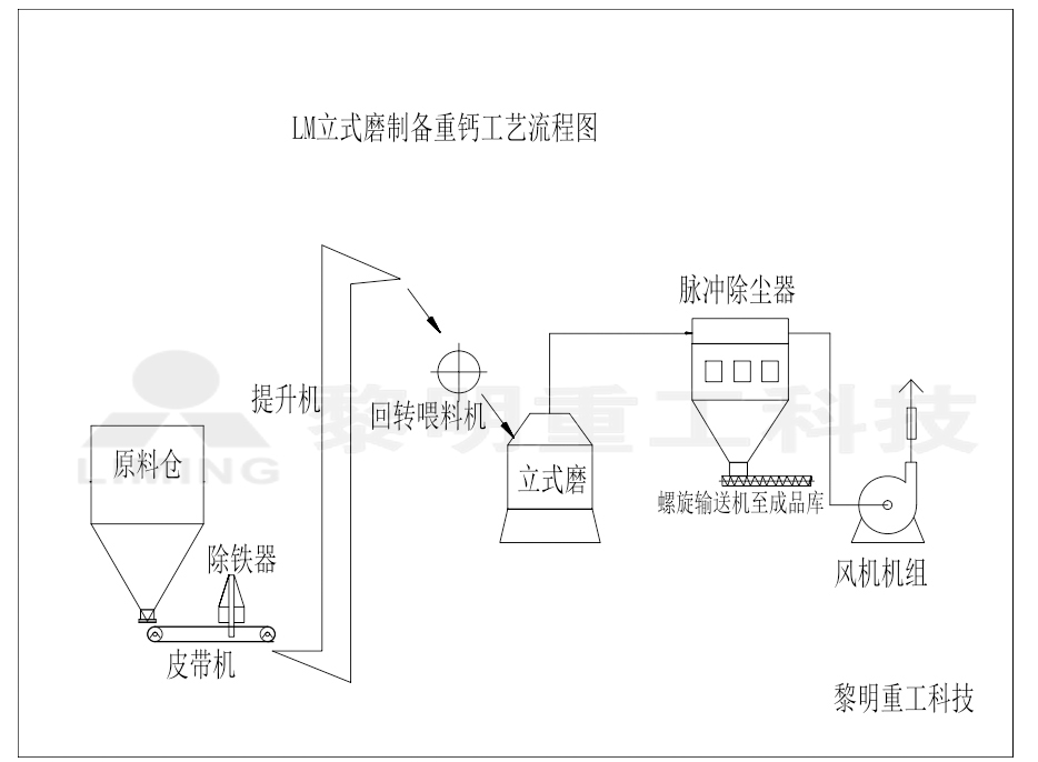 黎明重工立式磨系統為開路系統,是結合近年來快速發展的磨粉機技術與中國的工況條件而開發設計的一款大型化、工業化制粉設備,尤其適用于規模化的碳酸鈣粉碎加工,其自動程度高、生產成本低、效率高,一次成品細度d97=200~38um,單機生產能力依機型不同在20~100T/H,其工藝流程圖看圖.