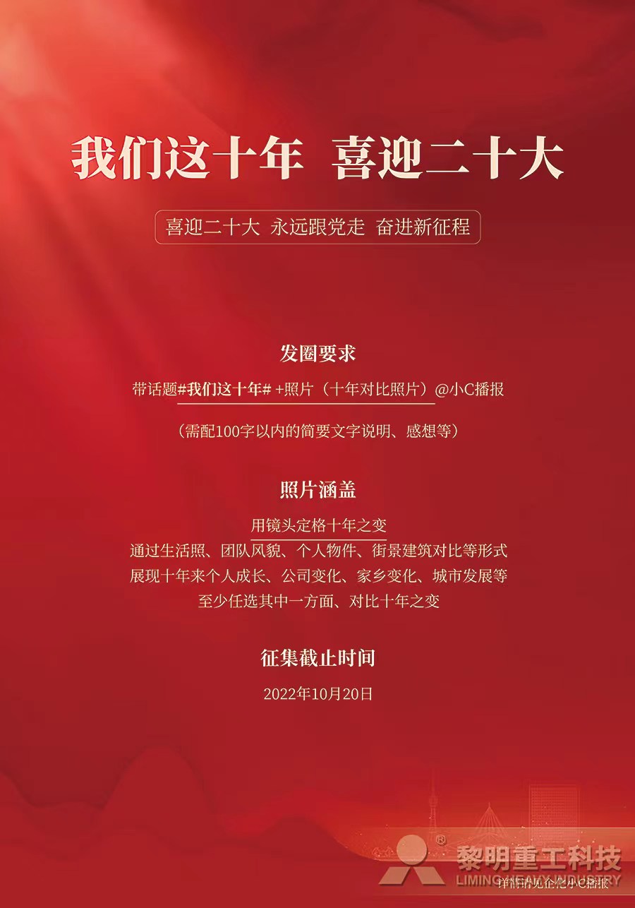 黨的二十大是在關鍵時期召開的關鍵會議,習近平總書記的講話是我們邁上全面建設社會主義現(xiàn)代化國家新征程、向第二個百年奮斗目標進軍的前進引領。開幕會結束后,黎明重工黨委積極響應上級黨組織號召,在企業(yè)內部掀起學習貫徹黨的二十大精神熱潮:動員全體黨員從自身角度出發(fā),發(fā)表對二十大報告的學習心得、反向反應,要求黨員把思想和行動統(tǒng)一到二十大精神上來,矢志不渝、篤行不怠,踔厲奮發(fā)、勇毅前行;在企業(yè)內部發(fā)起“我們這十年,喜迎二十大”互動討論,組織黨員和群眾以個人視角感知并記錄十年來,個人、企業(yè)、家鄉(xiāng)或者國家的變化,以此激勵大家不忘初心、肩負責任、踐行使命;同時,在二十大召開前夕,發(fā)動各位黨員拍照打卡,送出對黨和國家的殷殷祝福,并以此為動力,以更飽滿的熱情投入新階段工作。