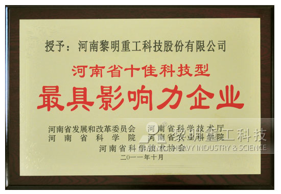 2011年度河南省十佳科技型企業(yè)(企業(yè)家)評選結果揭曉,黎明重工科技喜獲“河南省十佳科技型具影響力示范企業(yè)”榮譽稱號。