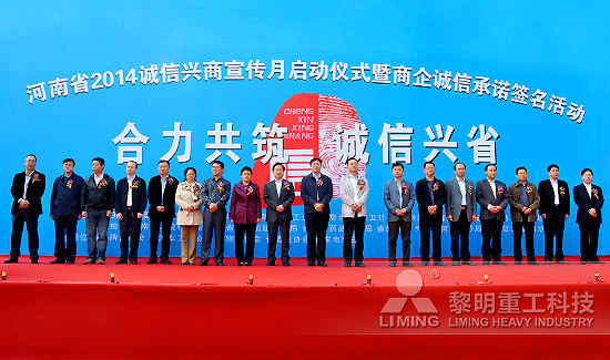 “誠信興商宣傳月”活動由河南省商務(wù)廳、中共河南省委宣傳部、河南省發(fā)改委等18個廳局聯(lián)合主辦,今年已是第10個年頭。該活動旨在倡導(dǎo)信用理念,構(gòu)建誠實守信的社會信用環(huán)境,樹立“合力共筑,誠信興省”的社會風(fēng)氣。黎明重工作為2013年河南省“十大誠信經(jīng)營典范單位”及“河南質(zhì)量誠信AAA級品牌企業(yè)”,秉承高質(zhì)量、重誠信的經(jīng)營理念和企業(yè)道德,推進社會誠信體系建設(shè)工作,責(zé)無旁貸。