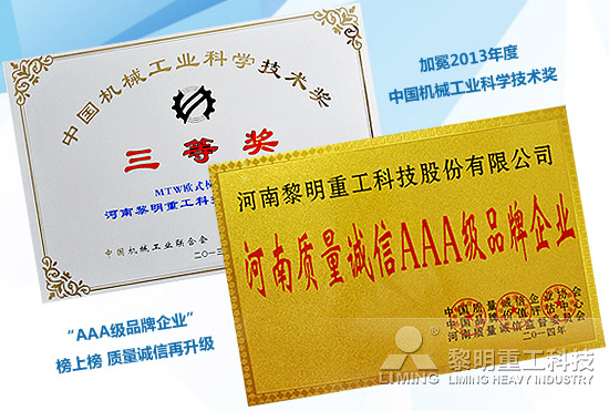 2014年年初,經中國機械工業科學技術獎評審委員會評審和中國機械工業科學技術獎管理委員會批準,黎明重工憑MTW歐式梯形磨粉機(MTW歐版磨)折桂2013年度中國機械工業科學技術獎三等獎。中國機械工業科學技術獎,是目前國內在機械行業中唯一由國家批準的獎項,是中國機械制造行業的“諾貝爾”獎。